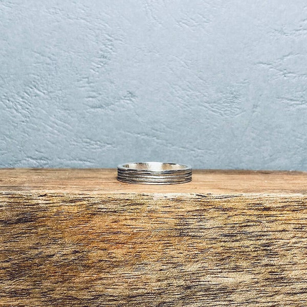 La bague Piétro Wood en argent massif est un anneau plat, type alliance dont la surface est travaillée à la main pour lui donner l'aspect du bois.