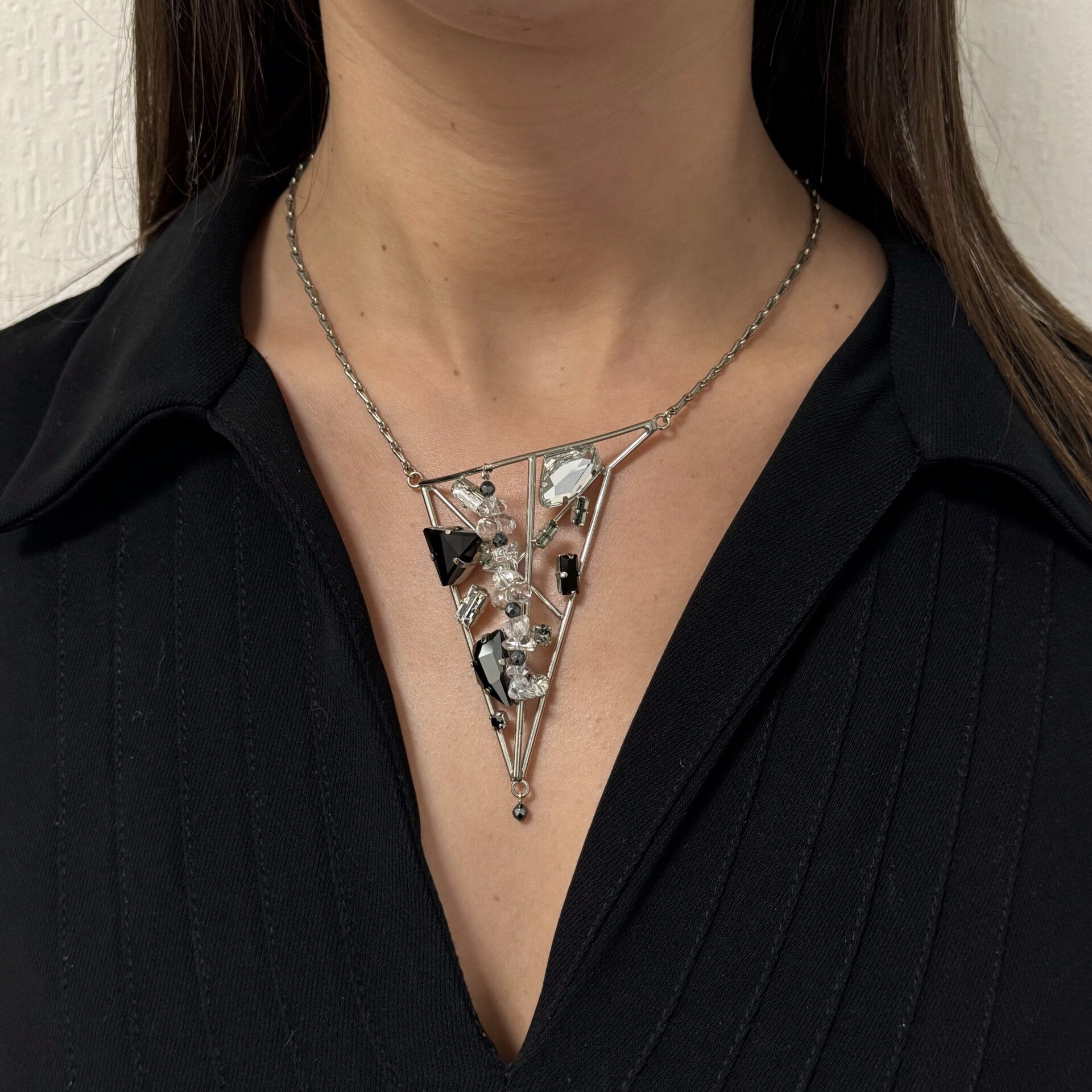 Il reprend les codes de la pièce maitresse aux mélanges envoûtants de cristaux Swarovski noir, cristal et diamant noir, de quartz et d'hématite. Ce joue un jeu de contraste saisissant entre les formes anguleuses de l'armature et le chatoiement des cristaux.