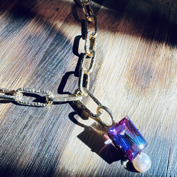 Le mariage subtil des cristaux Swarovski couleur améthyste ou transparents, des perles synthétiques nacrées et la dorure évoque l'élégance intemporelle de Chanel, Christian Lacroix ou encore Lanvin.